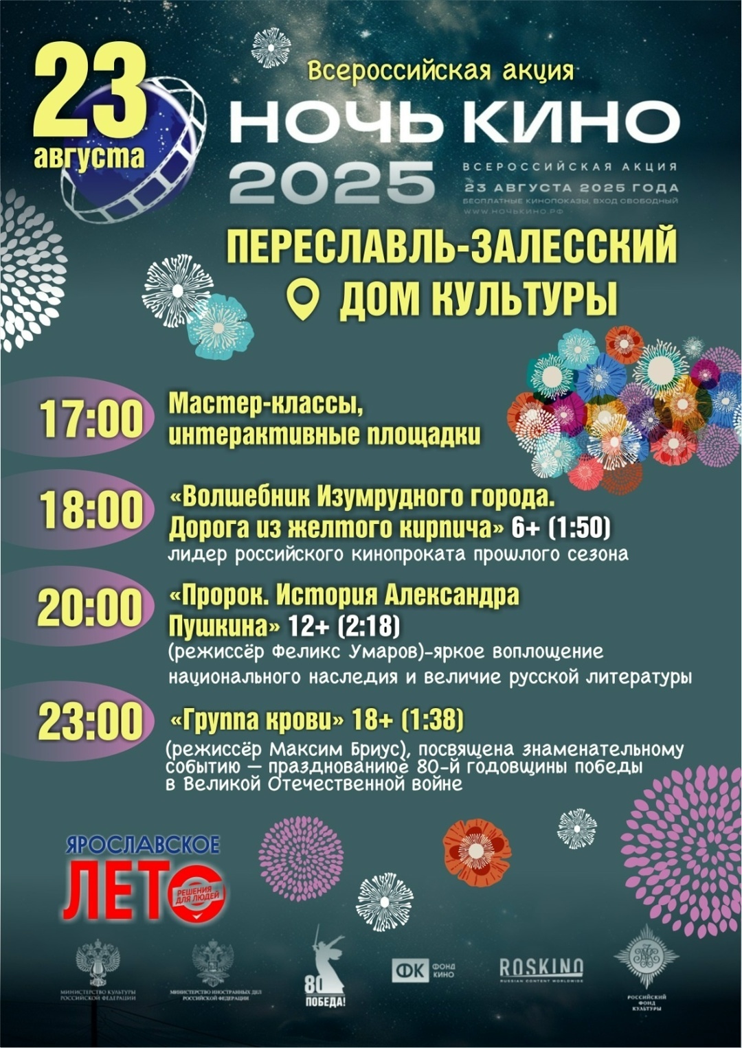 Под занавес лета зрители смогут насладиться военной драмой «Группа крови», посвящённой 80-летию Великой Победы, а также хитами проката — фильмами «Волшебник Изумрудного города. Дорога из жёлтого кирпича» и «Пророк. История Александра Пушкина».